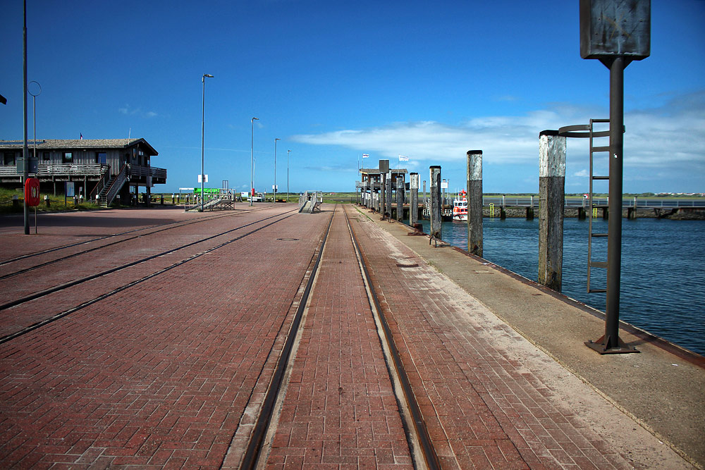 Ohne Bahnsteig kommt der Haltepunkt am Anleger aus, denn die Gleise sind ebenerdig verlegt, ähnlich wie bei einer Straßenbahn. Für Reisende mit Rollstuhl oder Kinderwagen stehen allerdings Rampen bereit, die im Hintergrund zu erkennen sind.