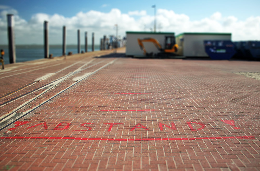 Um die Covid-19-Ansteckungsgefahr zu minimieren, ist es wichtig, beim Gang auf die Fähre nicht zu drängeln und Abstand zu halten. Die Markierungen auf dem Boden dienen hierbei zur Orientierung – nur leider halten sich viele nicht daran.