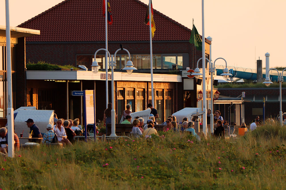 Abendstimmung auf der Promenade. In der Bildmitte das Gebäude der Gemeinde- und Kurverwaltung, in dem sich auch das Digger's befindet. Dahinter erkennt man das Servicegebäude mit Veranstaltungsraum »Oberdeck« am Platz am Meer und im Hintergrund einen Teil der Riesenrutsche des Meerwasser-Freizeitbades.