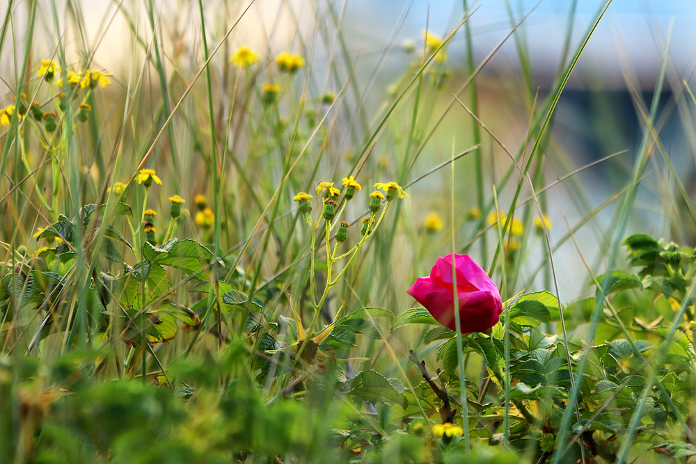 Rosa blüht die Kartoffelrose hier in den Dünen nördlich der Strandpromenade.