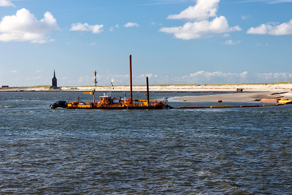 Per Saugbagger wird ein Sand-Wasser-Gemisch durch eine lange Rohrleitung bis zu den Harle Hörn-Dünen im Hintergrund transportiert. Es soll ein Verschleißkörper vor den Dünen erstellt und das Strandniveau erhöht werden.
