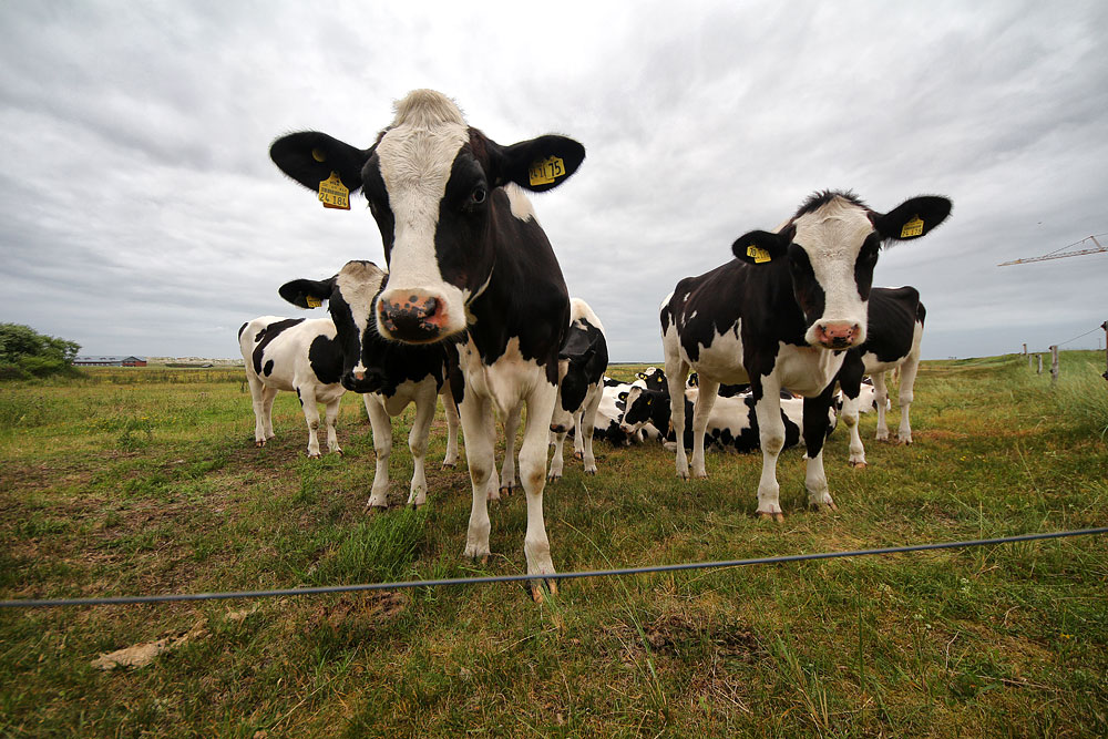 Neugierig betrachten die schwarzbunten Kühe die Kamera.