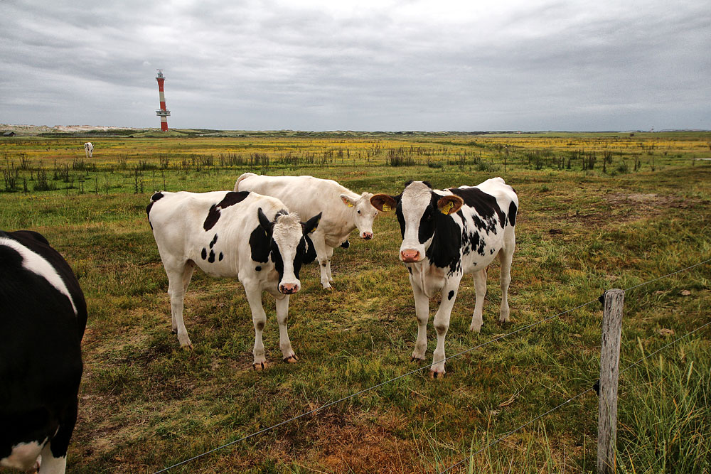 Rindviecher auf der Weide im Westinnengroden. Im Hintergrund erkennt man den Neuen Leuchtturm.