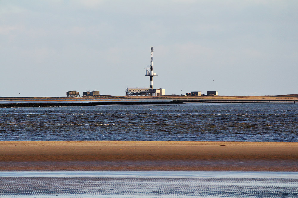 Neben dem Radarturm Minsener Oog Buhne C erkennt man auch den Mannschaftsbereich mit Wohnbaracken für die WSA-Mitarbeiter sowie für einen Vogelwart, der in den Sommermonaten ebenfalls dort wohnt.