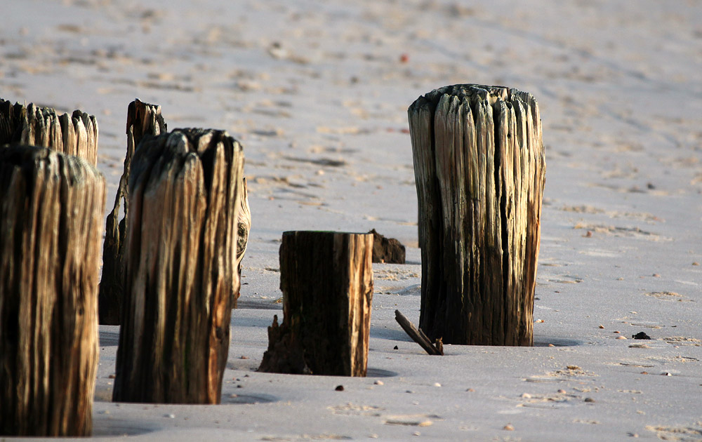 Tiefe Furchen durchziehen diese Pfähle am Ostende, über Jahrzehnte haben Meerwasser und Luft am Holz genagt.