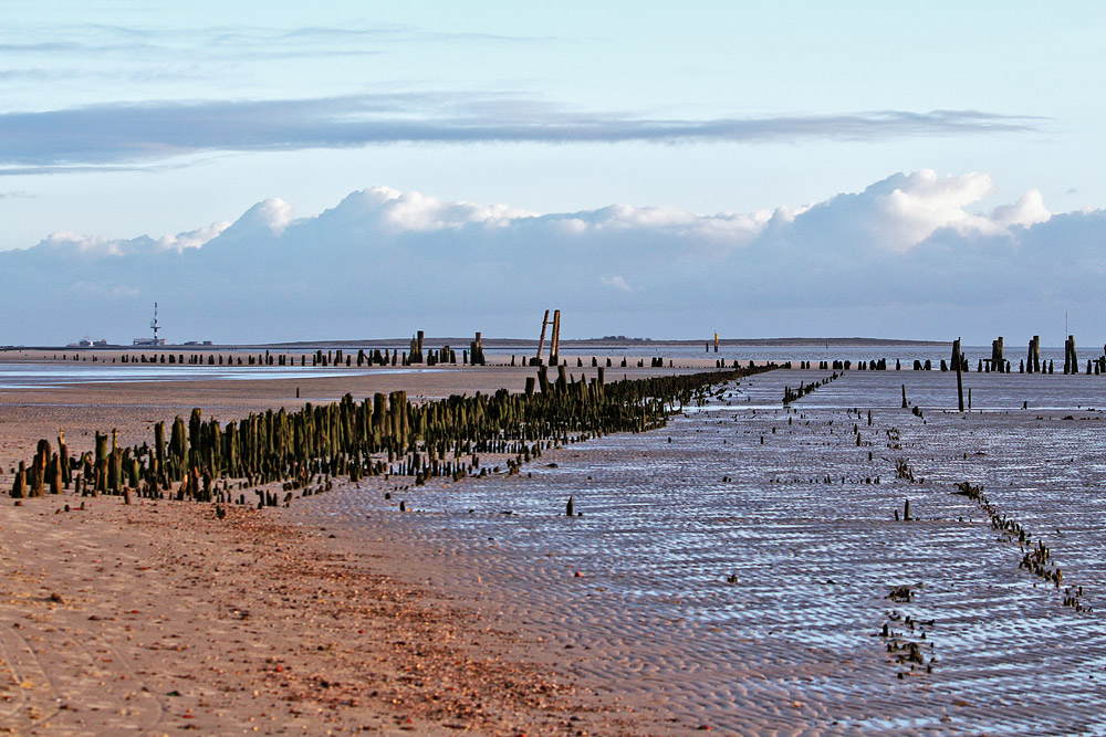 Anhand der Pfahlreste am Wangerooger Ostende kann man noch gut erkennen, wo sich einst die Anlegestelle befand. Ganz hinten die Nachbarinsel Minsener Oog, die durch die Blaue Balje von Wangerooge getrennt ist.