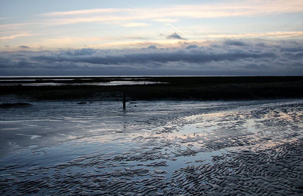 Geradeaus sehen wir die östlichen Ausläufer der zum Ostaußengroden gehörigen Salzwiesen. Es dämmert bereits, da wird es Zeit, nach Haus zu kommen.