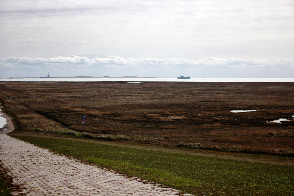 Ein Blick vom Ostgrodendeich in Richtung Außengroden. Neben dem Ostaußengroden und der Nachbarinsel Minsener Oog sehen wir zudem das Motorschiff Wangerooge, das sich auf einer Überführungsfahrt im Wattfahrwasser der Telegraphenbalje südlich der Insel befindet.
