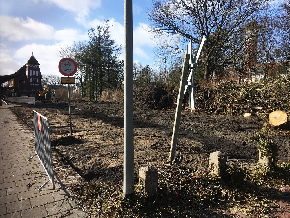 Da für den barrierefreien Bahnsteig deutlich mehr Platz benötigt wird, hat man den südlichen Teil des Hindenburgplatzes vom dichten Strauchwerk sowie von mehreren größeren Bäumen befreit.
