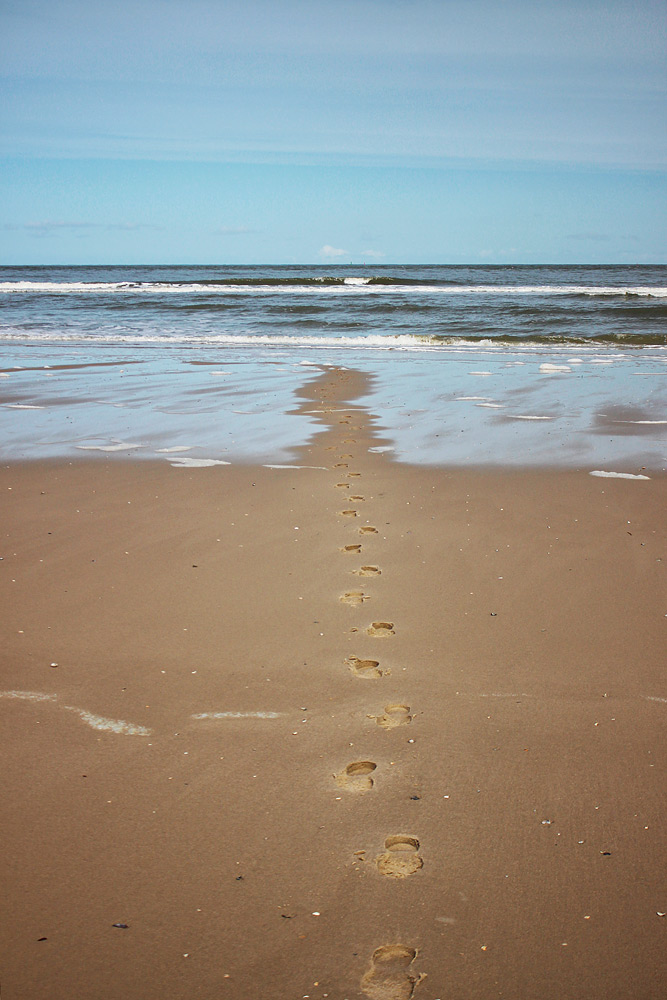 ‹ Fußspuren im feuchten Sand des Oststrandes.