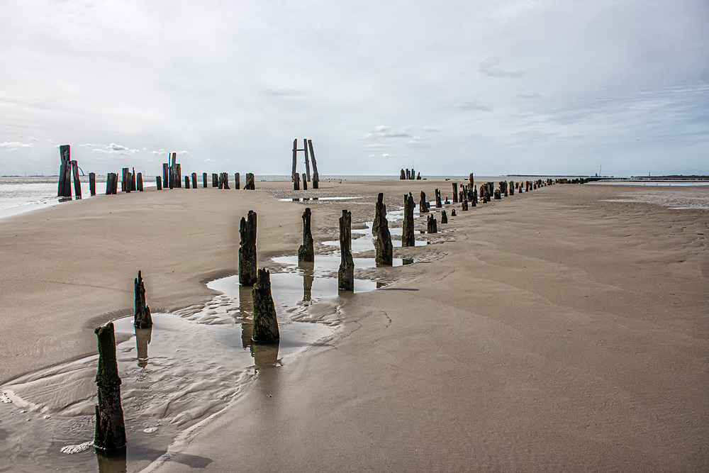 Pfahlreste der ehemaligen Anlegestelle des Norddeutschen Lloyd, welcher einst Fahrten aus Bremerhaven und Wilhelmshaven auf die Insel anbot.