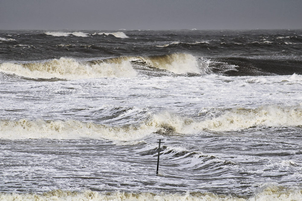 Mitte Februar 2022 zieht das Orkantief Ylenia über die deutsche Nordseeküste hinweg und verursacht eine Sturmflut, die mit großen Schäden am Wangerooger Badestrand einher geht. Hier ein Blick auf die Brandung im Bereich der Buhne P.