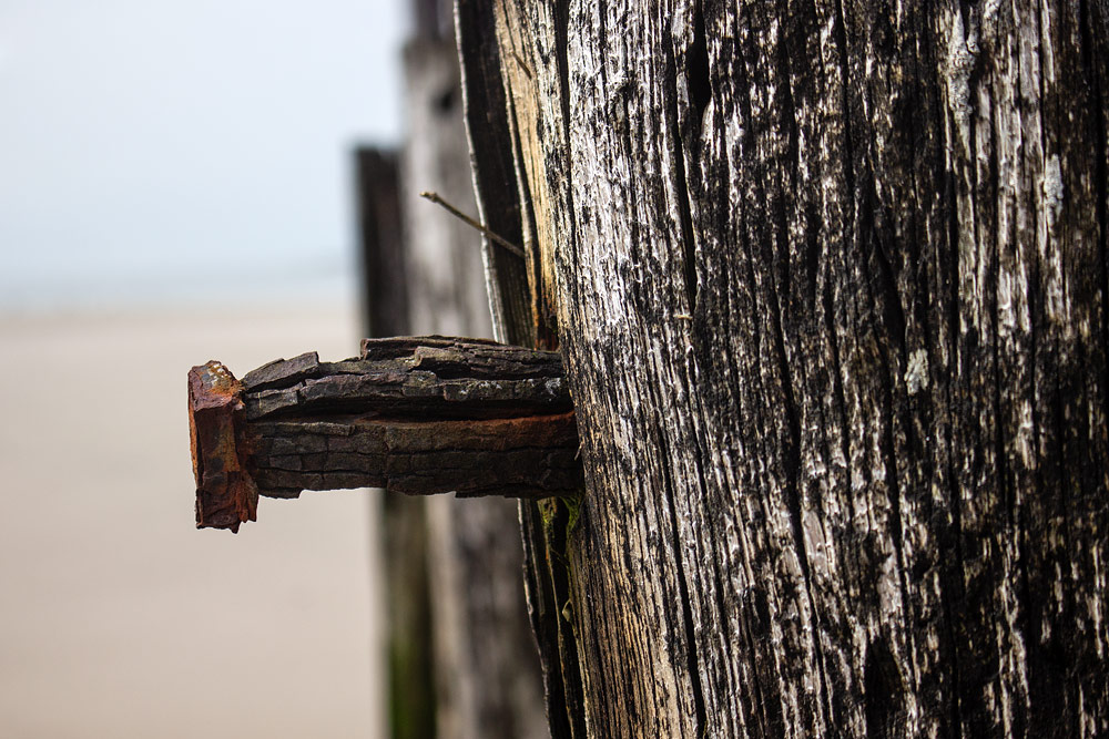 Sowohl an dem Stahlnagel als auch am Holzdalben, der zum ehemaligen Ostanleger gehört, nagt sehr offensichtlich der Zahn der Zeit.
