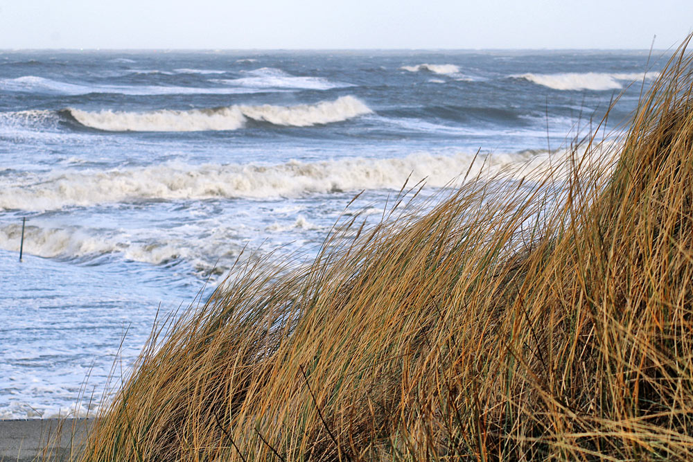 Blick auf die tosende Nordsee. Vorn die Dünen im Bereich der Westingstraße, hinten die überflutete Buhne P. Östlich dieser Buhne befindet sich im Sommer das Ostbadefeld.