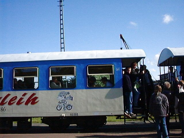 In diesen tollen himmelblauen Waggons sitzen Sie, wenn Sie zur Insel kommen