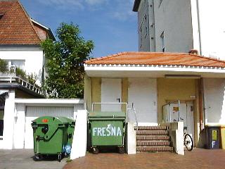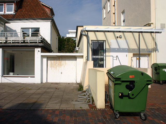 Vor uns der Hintereingang des örtlichen Drogeriemarktes, damals »IhrPlatz«,