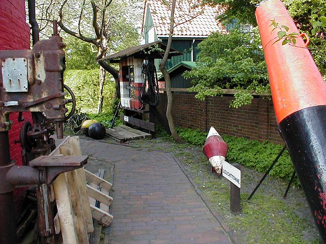 Leuchttonne (rechts) und eine alte Rettungsinsel (geradeaus) zu sehen sind.