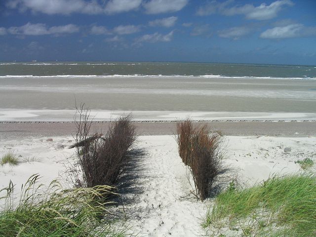 sehen wir den Sandstrand bei Niedrigwasser.