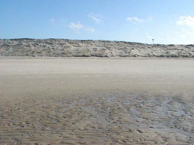 Man sieht dies an dem breiten Streifen nassen Sandes.