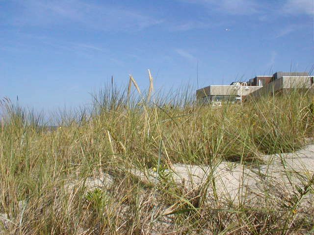 Hinter den Dünen sehen wir den oberen Bereich des Kurhauses »Graf Luckner«.