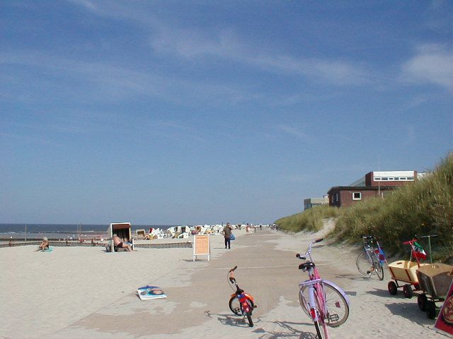 Dort vorne stehen nun die ersten, westlichsten Strandkörbe der Insel.