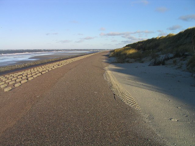 man kann dies unter anderem an den Fahrspuren im Sand sehen.