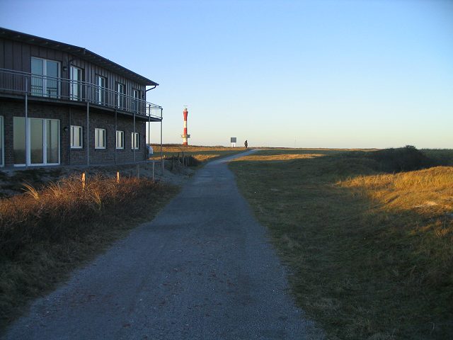 Vor uns befindet sich der rot-weiße Neue Leuchtturm,