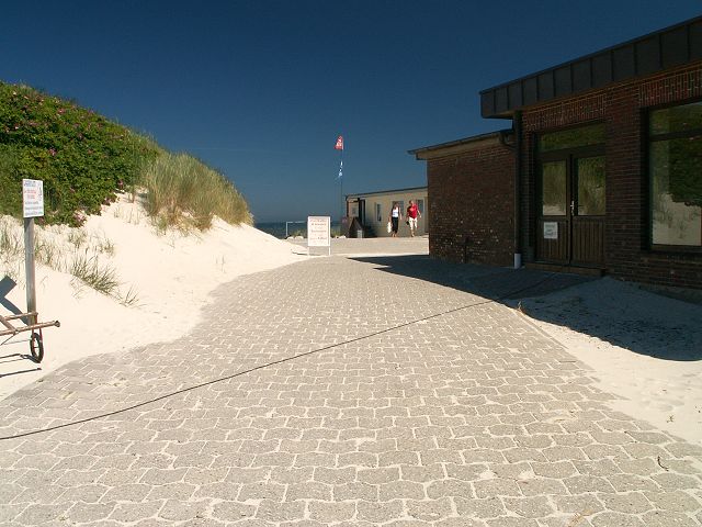 An der Tischtennishalle (rechts) vorbei geht es weiter zum Surfstrand.