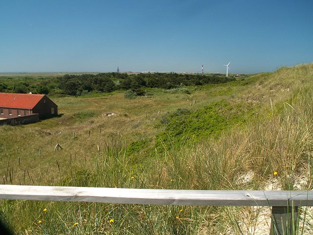 der Düne hinabsteigen. Im Hintergrund der Westturm und der Neue Leuchtturm.