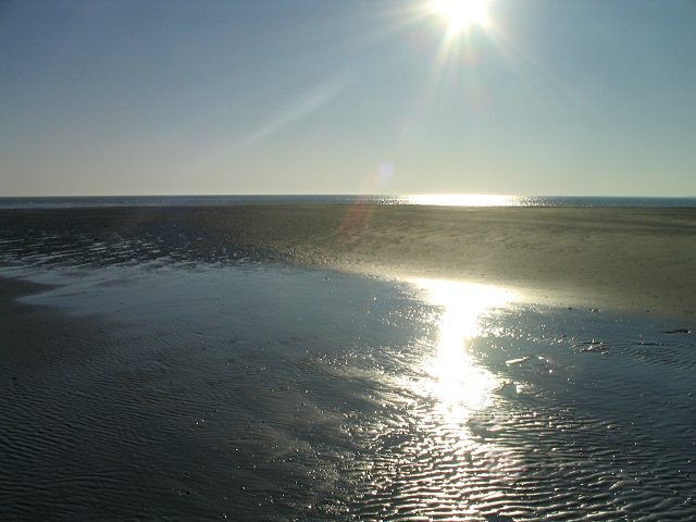 Auf dem nassen Sand spiegelt sich die tiefstehende Sonne.