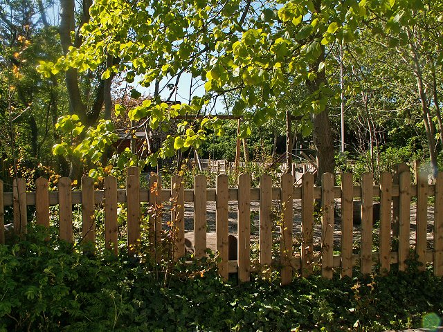 Man sieht den Schulhof schon – bzw. einige Spielgeräte.