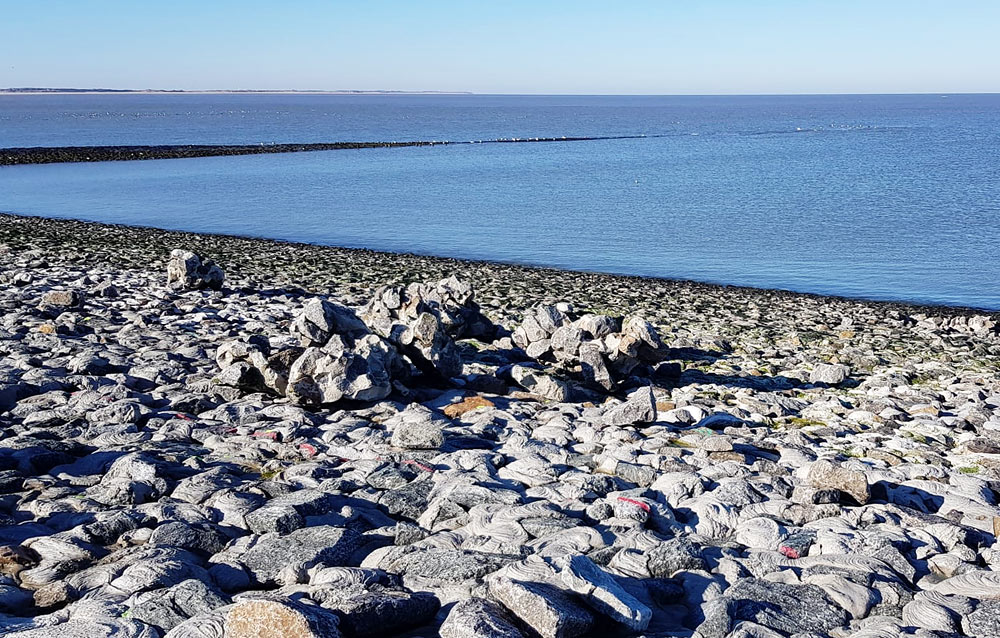 Ganz rechts erkennt man einen kleinen Teil der Schadstelle, die bei den Sturmfluten im Winter 2021/'22 am Westdeckwerk entstanden ist. Große Brocken aus Wasserbausteinen und Beton sind von den Wellen mehrere Meter höher abgelegt worden – schon beeindruckend, welche Macht die Wellen haben können.