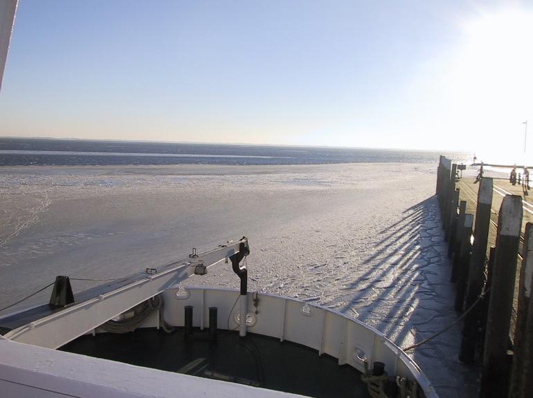 Die Fahrt kann losgehen, wenn denn die Vertäuung gelöst ist. Unten sehen Sie den Bug der MS ›Wangerooge‹.