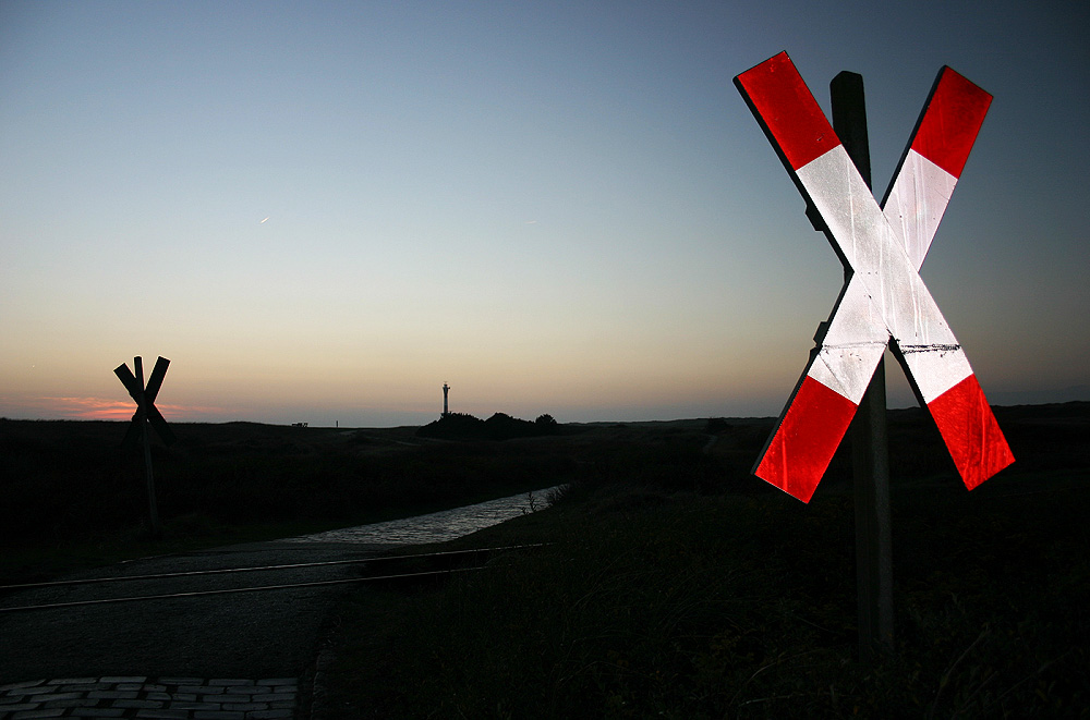 Die Andreaskreuze reflektieren den Blitz des Fotoapparates aber toll… Im Hintergrund noch einmal der Neue Leuchtturm.