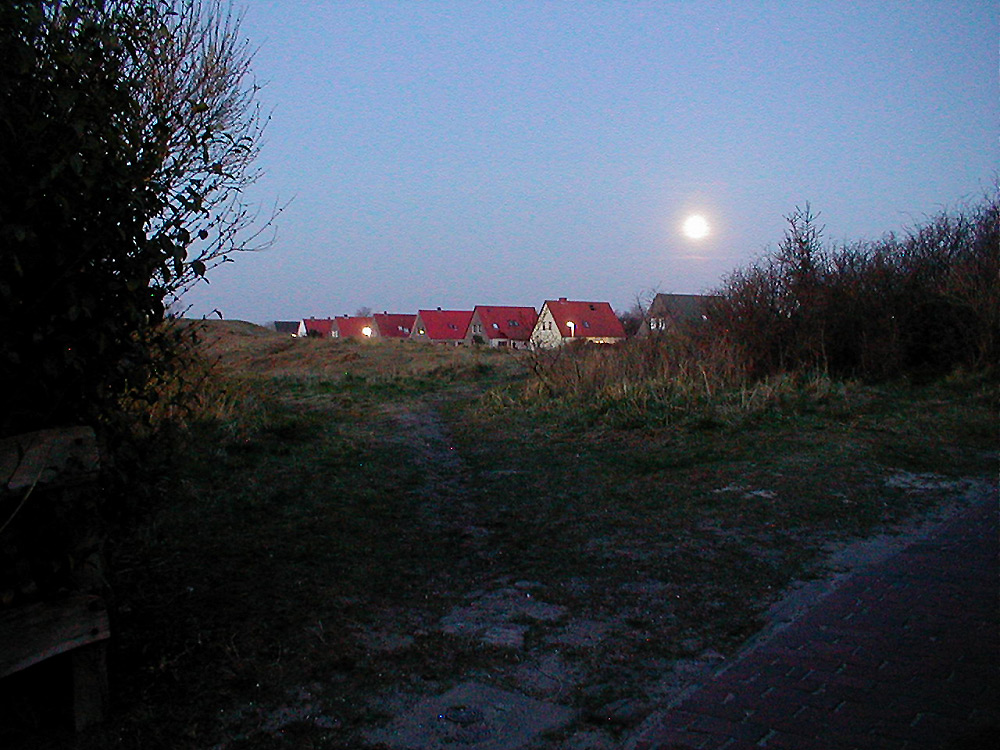 Der Abend bricht an, wir sehen einen tiefstehenden Mond über den in den 1920er Jahren erbauten Häusern, nach denen die »Siedlerstraße« benannt wurde.