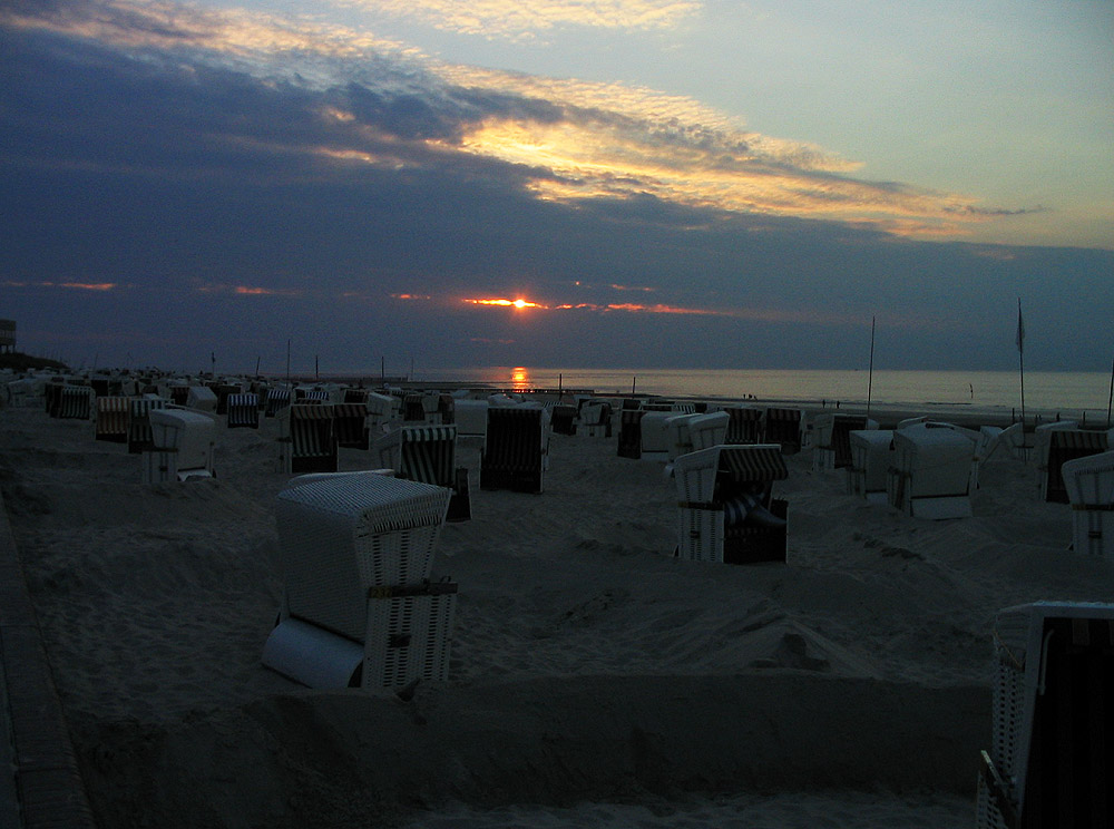 Ein letztes Mal schaut die Sonne durch eine winzige Wolkenlücke hindurch auf den Hauptstrand mit seinen ca. 1200 Strandkörben.