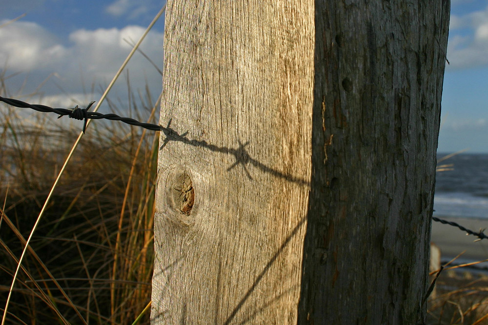 Solche Holzpfähle mit Stacheldraht markieren die Wege, die betreten werden dürfen bzw. andersherum das Dünenschutzgebiet, das nicht betreten werden darf.
