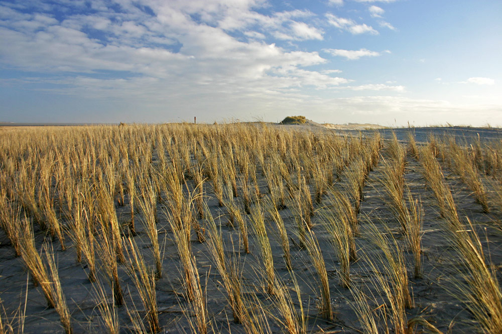 Sauber in Reihe und Glied wurde das Dünengras von Mitarbeitern des Wasser- und Schiffahrtsamtes gepflanzt. Das Gras hält durch seine Wurzeln den Sand fest, so daß sich die Düne nach einem Sturm nicht plötzlich woanders befindet (bzw. der Sand der Düne).