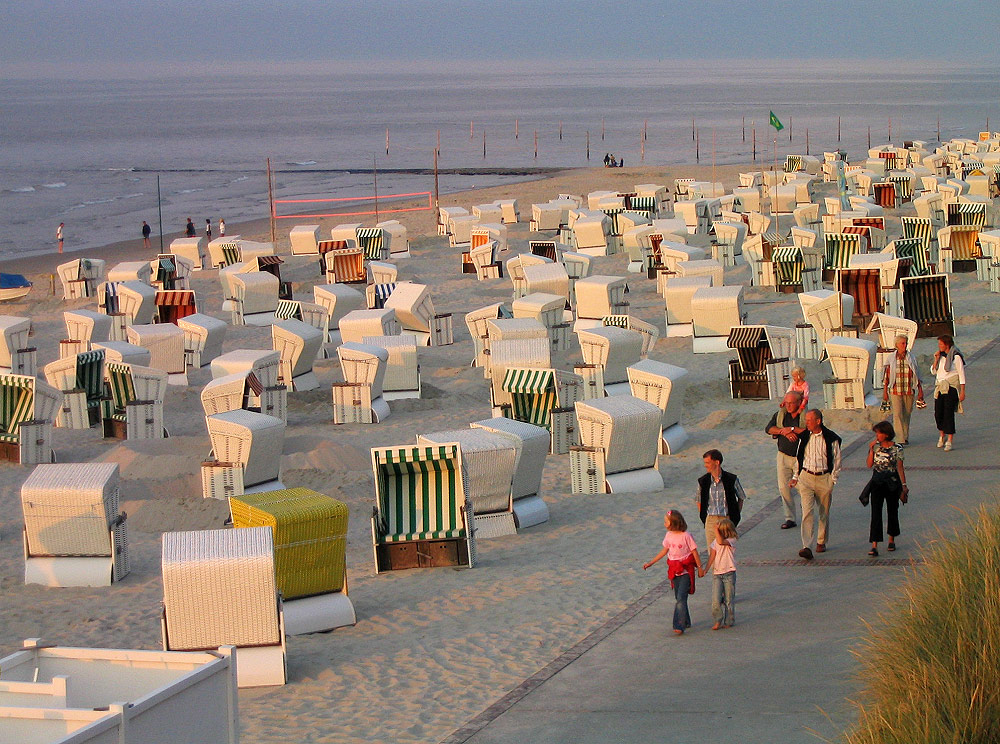Der Strandkorb mit der Nummer »0« sticht wegen seines gelben Oberteils aus dem Meer weißer Körbe heraus. Normalerweise steht er unter der Uhr, doch wenn Not am Mann ist, wird auch er an den Strand gestellt.