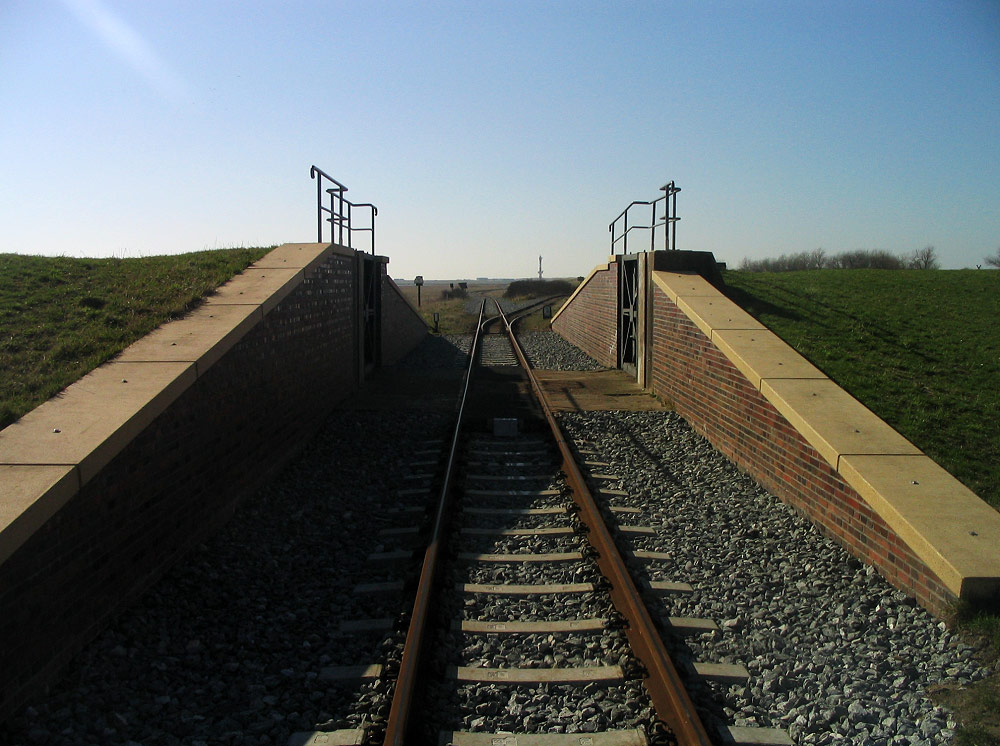 Die erst vor ganz kurzer Zeit runderneuerten Inselbahn-Gleise (am neuen Schotterbett gut zu erkennen) führen durch das Deichschart vom Bahnhof bis hin zum Westanleger.