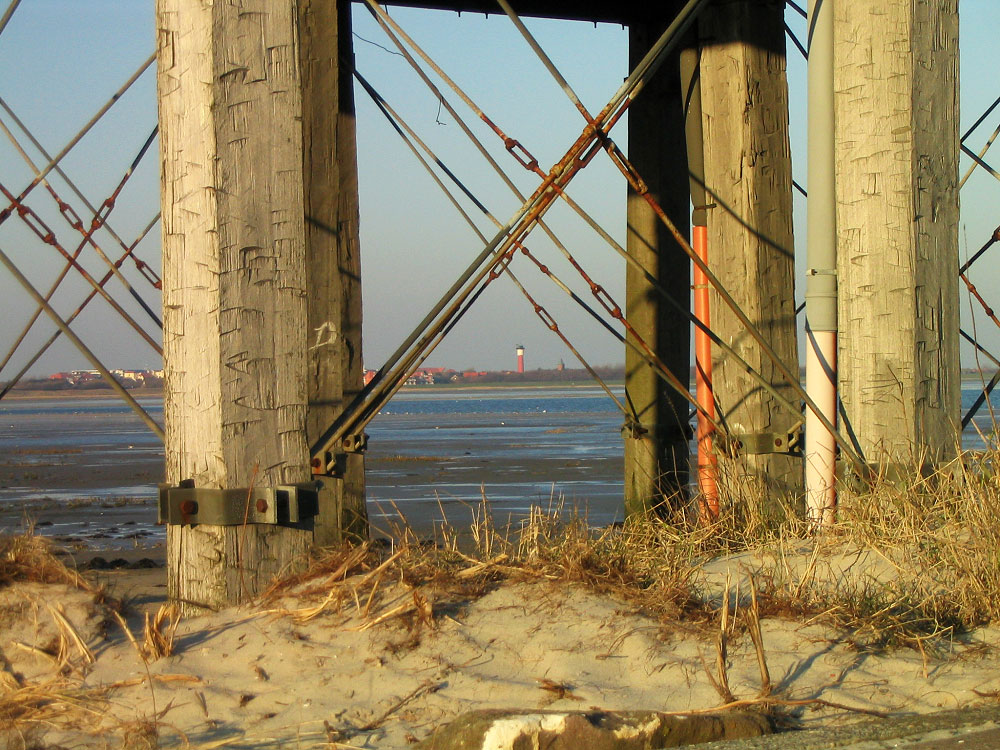 Durch die Pfähle hindurch, die die Hütte des Hafenmeisters tragen, sehen wir die Salinebucht und das Dorf mit Altem Leuchtturm.