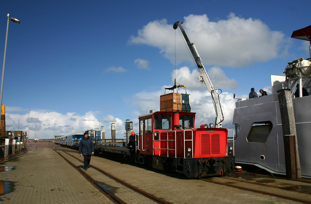 Gleich werden die letzten Gepäckcontainer auf die ›Harlingerland‹ geladen, danach wird das Fahrpersonal die Schöma-Lok ›399 107-2‹ wieder zum Inselbahnhof bewegen.