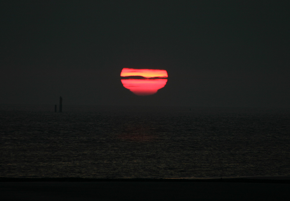 Ganz schwach – in schwarz auf dunkelgrau – kann man den Pegel erkennen, der sich nordöstlich des Hauptstrandes befindet. Aber wer achtet bei dem atemberaubenden Anblick der aufgehenden Sonne schon auf so etwas relativ Unromantisches wie den Pegel…