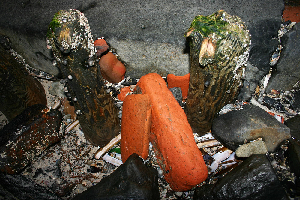 Uralte Klinkersteine finden sich am Rand dieser Buhne, genau wie Seepocken und zahlreiche Muscheln und Schnecken.