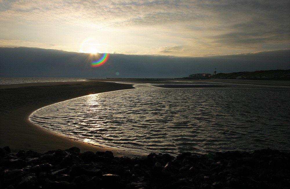 Von der Buhne »K« aus wird hier noch einmal in Richtung Osten geblickt. Einen schönen runden Priel haben wir vor uns, in welchem sich die aufgegangene Sonne spiegelt.