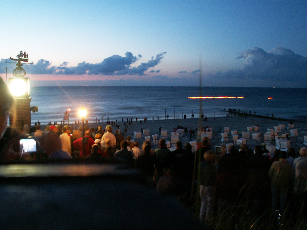Das sogenannte »Fackelschwimmen« der DLRG lockt Jahr für Jahr zahlreiche Schaulustige an die Strandpromenade. Mit Fackeln wird dort vom Ost- ins Hauptbad geschwommen, zum Aufnahmezeitpunkt sind die Schwimmer kurz vor der Buhne angelangt.