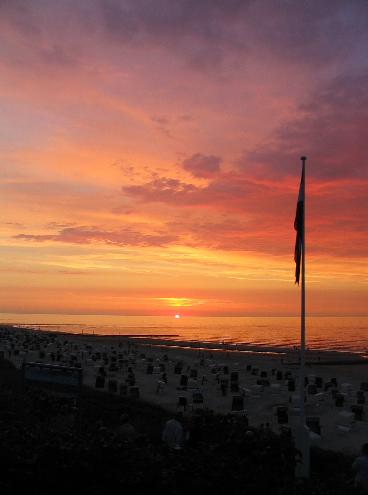 ‹ Jetzt gleich wird die Sonne hinter dem Horizont verschwunden sein. Kein Lüftchen regt sich, wie man gut an der Flagge erkennen kann.