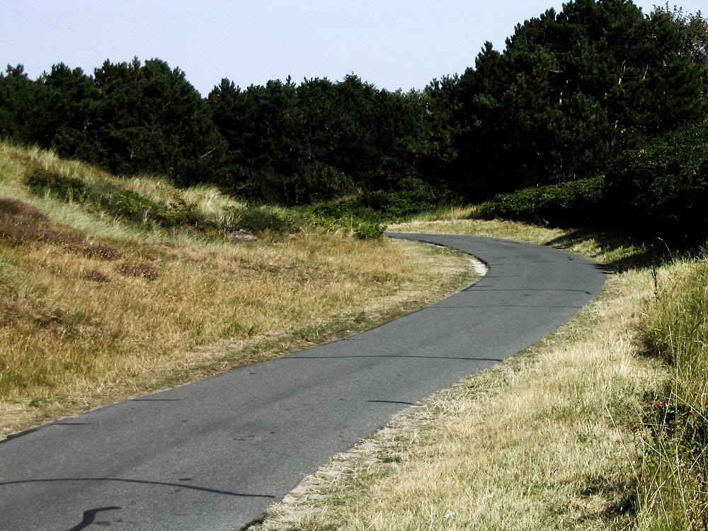 Nördlich des Inselfriedhofs beschreibt die »Straße zum Westen« eine S-Kurve, hier geradeaus sieht man den ersten Bogen. Danach geht es wieder rechts und dann auf geradem Wege auf das Dorf zu.