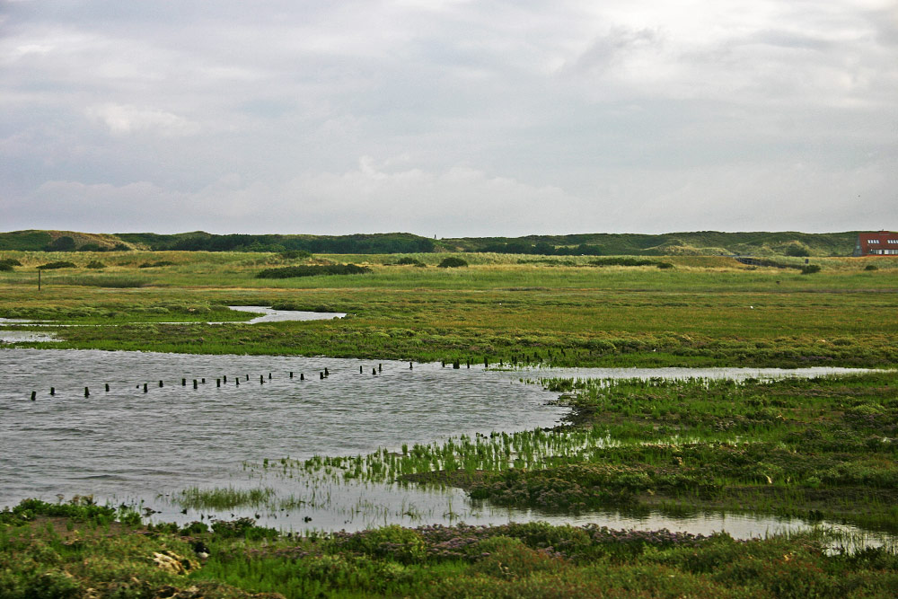 Bei jeder Flut drückt das Meerwasser durch die Durchlässe im Bahndamm in den Westaußengroden und bildet dort eine hübsche Lagunenlandschaft. Rechts hinten (das Erdgeschoß ist vom Deich verdeckt) ist noch die »Saline« zu erkennen.
