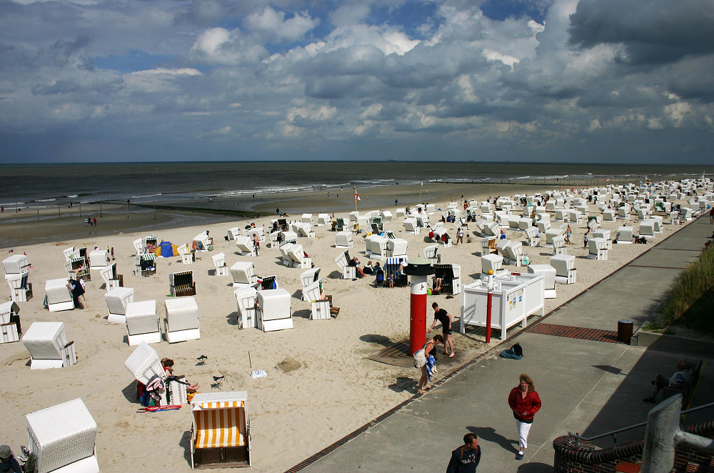 Wangerooge ist die Insel der Türme – selbst die Duschen am Hauptbad sind wie ein Leuchtturm gestaltet. Dahinter befinden sich die unzähligen Strandkörbe des Mittelfeldes, Sektor »To« (Toilette) bzw. »Ger A« (Gerken Anfang).